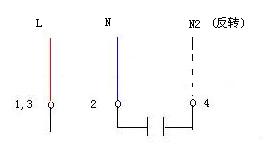 當兩繞組完全一樣,電機可能是三端子接線,1,3為兩繞組的公共接線端,接交流電源的L, 2/4端子之間聯(lián)有啟動電容, 如果交流電源的N端接端子2為正轉(zhuǎn),則N改接端子4為反轉(zhuǎn);如果是四端子,見圖四接線;